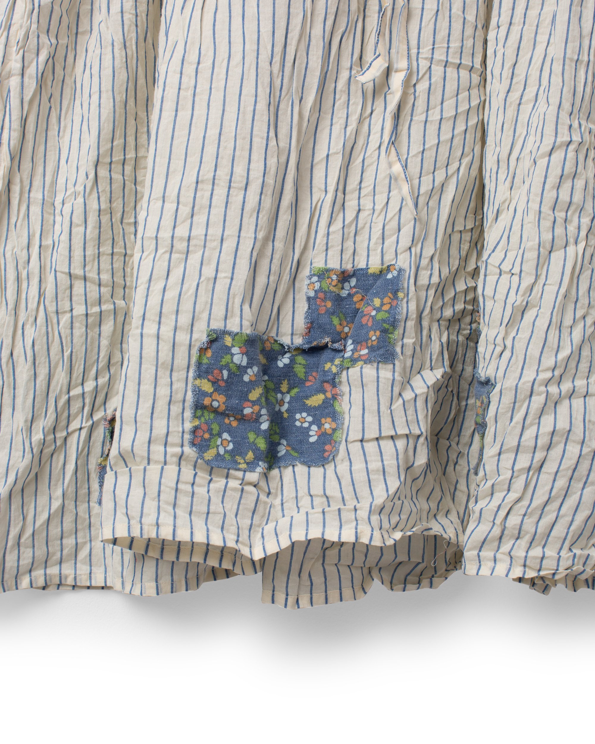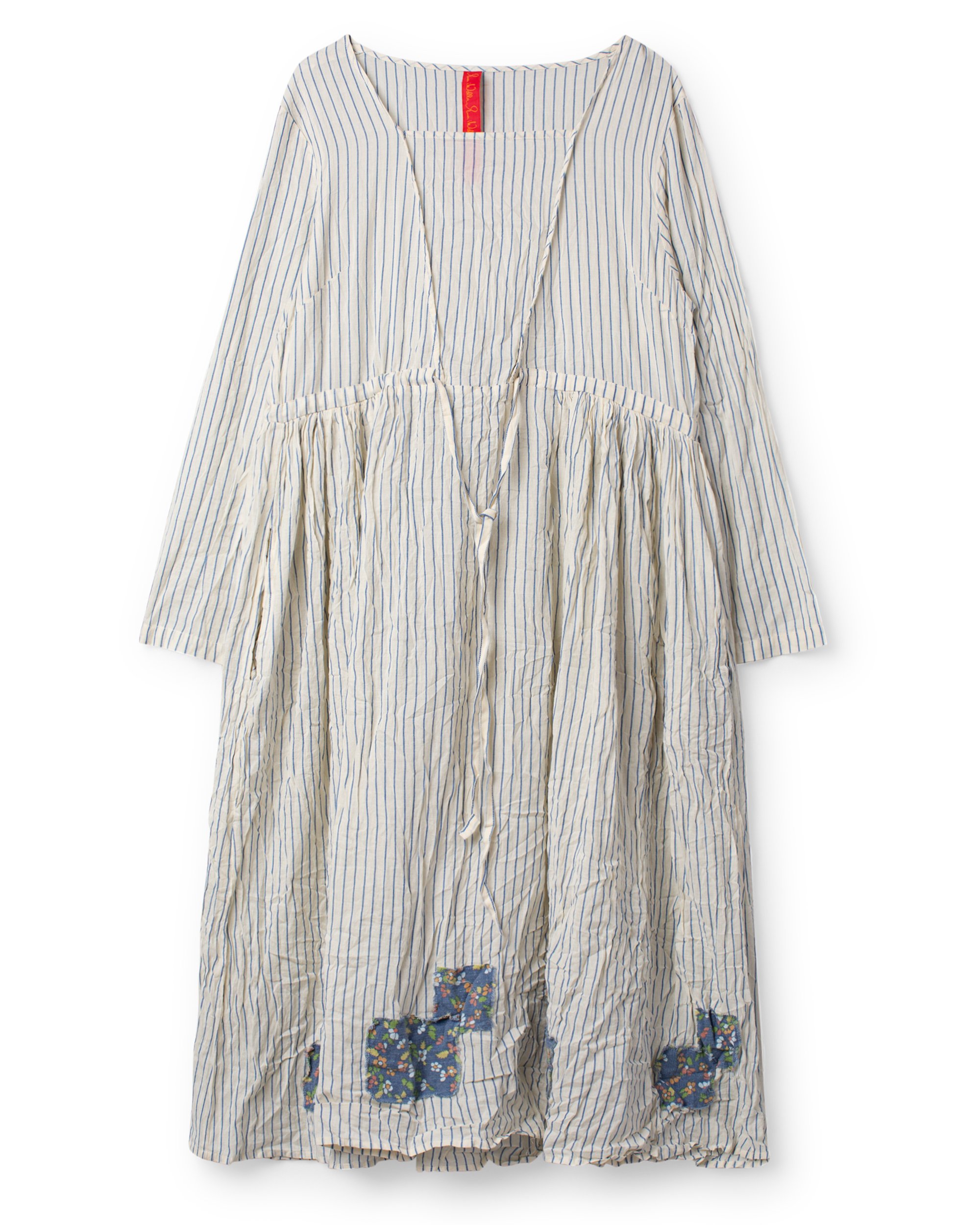 Calf-length dress in striped cotton voile with long sleeves, drawstring with tie ribbons at waist and partially wrinkled skirt for a lovely volume. Decorated at the bottom with wrinkled frills and floral pathces in twill, side seam pockets.